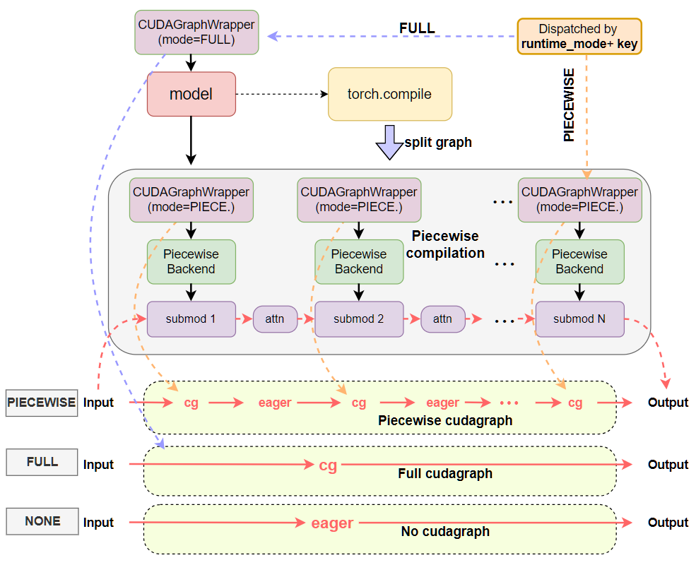 雖然 NONE、PIECEWISE 和 FULL 是單模式配置,並且分別相當於過去即時執行、分段 CUDA 圖和完整 CUDA 圖的實現,但 FULL_DECODE_ONLY 和 FULL_AND_PIECEWISE 是新新增的雙模式配置,它們需要透過排程根據執行時批次動態切換到具體的執行時模式。