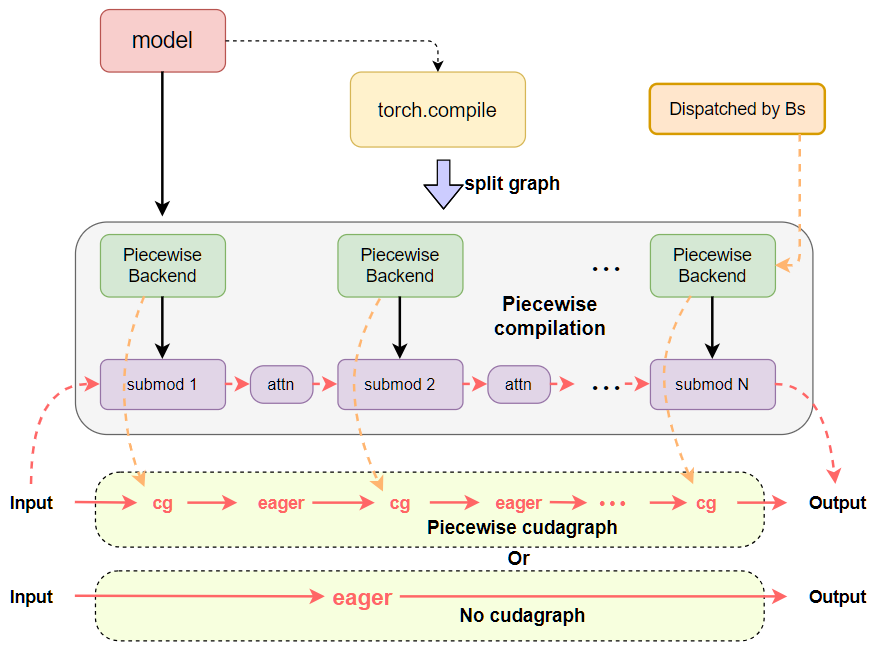 在 dispatch() 方法內部,排程器將搜尋合適的 CUDA 圖執行時模式和現有的排程鍵以返回。我們基本上按照優先順序搜尋現有鍵:FULL>PIECEWISE>None。如果排程鍵不存在,則預設返回 NONE 模式以進行即時執行。實現可以在 此處找到。