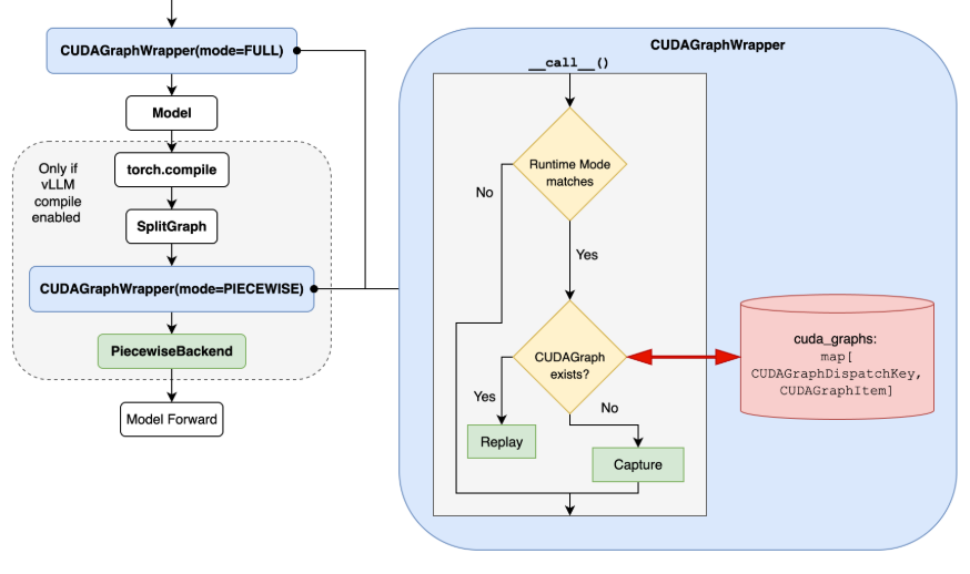 - CudagraphDispatcher:中央控制器,包含 CUDA 圖的唯一事實來源,並負責在它們之間進行排程。