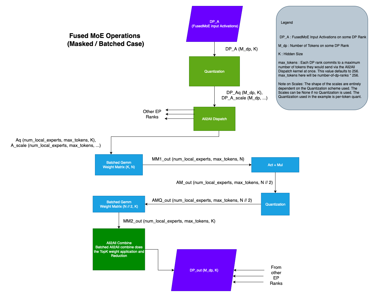 DeepEPHTPrepareAndFinalize作為示例。 - 在批次變體中,All2All Dispatch 返回一個形狀為 (num_experts, max_tokens, K) 的張量。在這裡,屬於同一專家的啟用/Token 被批次處理。請注意,並非該張量的所有條目都有效。啟用張量通常伴隨一個大小為